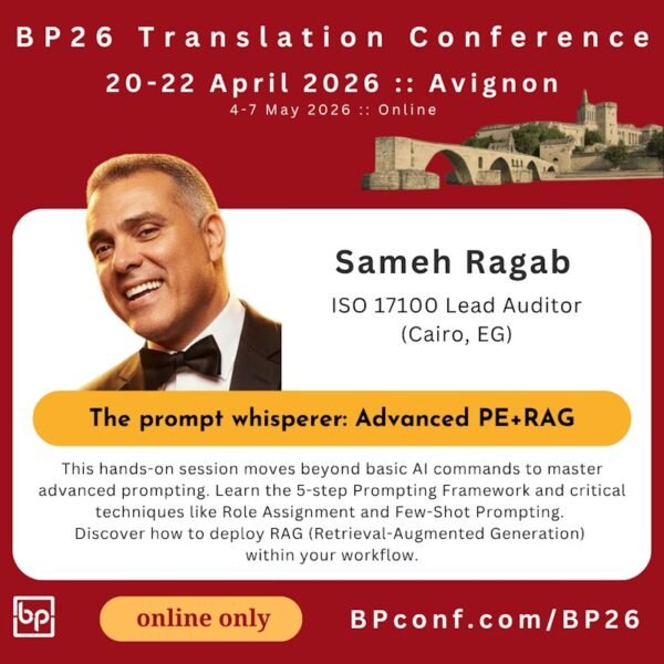 The other two workshops (‘Technology for translators’ by Carlos la Orden Tovar and ‘The AI playbook for translators’ by Marta Mamet-Michalkiewicz) will take place on 20 April, and will be available for separate tickets (i.e. thy are not included in the conference tickets).