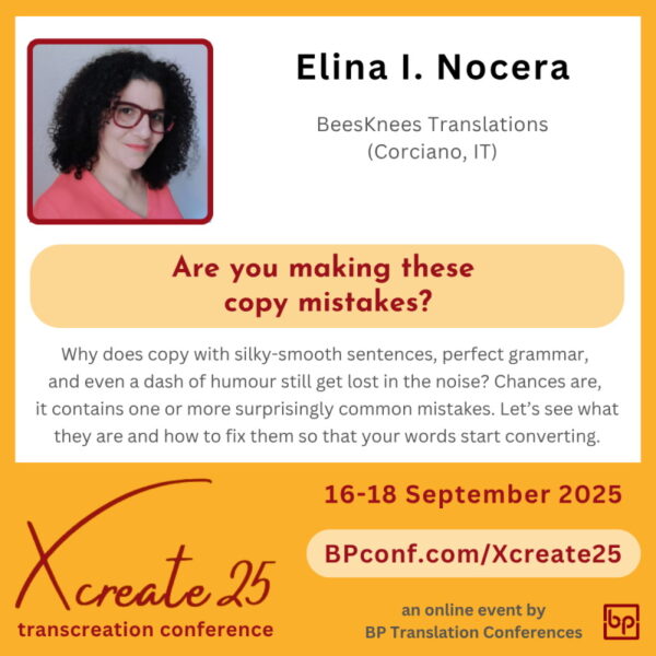 Elina I. Nocera is a bilingual Italian–English marketing translator with 17 years of experience who recently branched out into copywriting. She helps brands and service-based businesses connect with their audiences through compelling copy and a natural tone of voice.