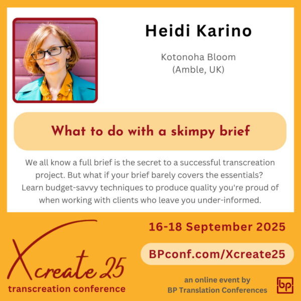 This practical session tackles the reality gap between what transcreators need and what clients actually provide. Learn practical techniques for handling inadequate client briefs, including how to extract missing information diplomatically and how to produce quality transcreation when working with minimal context.