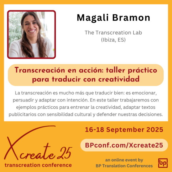 Magali Bramon is the founder of The Transcreation Lab, a boutique studio specializing in marketing translation, transcreation, and SEO. With over 18 years of experience in the language industry, she has worked with top global brands in fashion, beauty, tourism, and tech, helping them craft multilingual campaigns that connect across cultures. Born in Italy and raised in Spain, Magali grew up bilingual and later became fluent in six languages. Her multicultural background and international career give her a sharp insight into the nuances of creative adaptation. Beyond her client work, Magali is passionate about empowering fellow translators. She regularly teaches courses on transcreation and marketing translation, and she’s committed to helping professionals position themselves as creative specialists—not just word vendors.