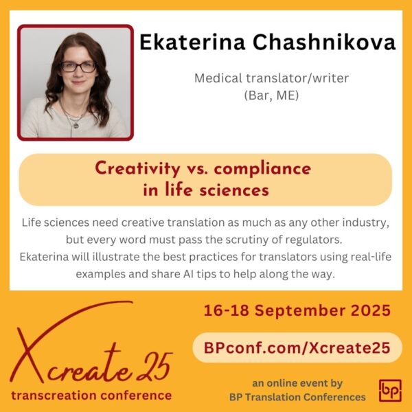 Ekaterina Chashnikova is a medical translator, content creator, and educator with a background in pharmacy. Committed to spreading knowledge and helping colleagues along their career paths, Ekaterina has been providing training for language professionals since 2015. Ekaterina created mymedpharm.info, a knowledge hub with a collection of credible online resources for medical writers and translators.