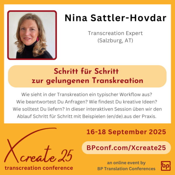 Nina Sattler-Hovdar ist weltweit für ihre Expertise im Bereich der Transkreation bekannt. Sie ist die Autorin der beiden Bücher „Translation-Transkreation“ und „Get fit for the future of transcreation“ und hält seit vielen Jahren Vorträge, Seminare und Workshops für Berufsverbände, Universitäten, Agenturen und Unternehmen. Aktiv ist sie auch auf LinkedIn und betreibt unter anderem einen Blog auf transcreationexperts.com